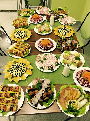 В меню — более ста видов горячих блюд, салатов, супов, закусок и десертов. Для всех желающих также организуются банкетные столы с доставкой на дом. Также предлагается доставка комплексных обедов — на дом или в офис.