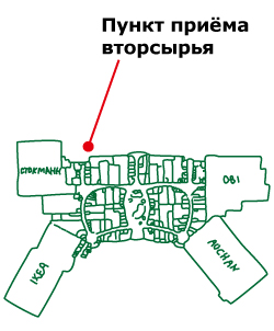 Работает пункт на парковке торгового центра «МЕГА Химки». График работы пункта приема вторсырья: среда, пятница, суббота с 16:00 до 20:00 (перерыв