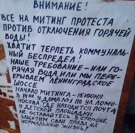 Фотография объявления с призывом выходить на митинг против «коммунального беспредела» опубликовано в твитере села Спас Заулок Клинского района. Митинг начнётся 15 июня в 14:00. Об отключении горячей воды на неопределенный срок в Клину и Солнечногорске сообщила в минувший четверг Русская служба новостей. Причина — многомиллионные долги за горячую воду. Однако без воды остались и те, кто исправно за неё платил. Глава Клинского района сообщила, что воды нет из-за планового отключения, которое продлится две недели. Но жителям, попавшим на приём, она же сказала, что воды не будет до октября.