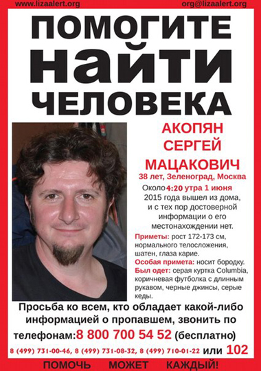 Всех, кому известно что-либо о судьбе Сергея Акопяна, просят обратиться по телефонам: 8(499)710-01-22, 8(499)731-08-32, 8(499)731-00-46, 8(800)700-54-52 или 102.