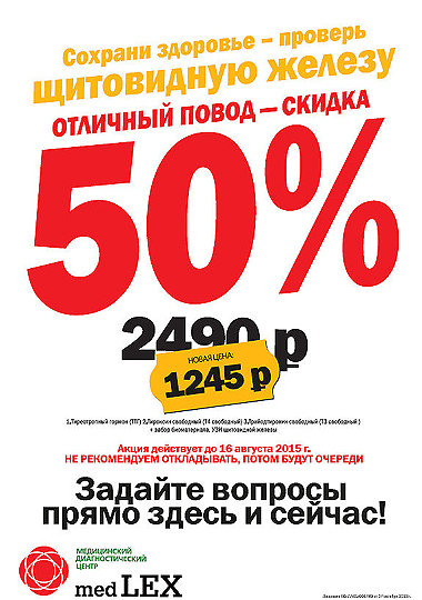 С связи с большим спросом и пожеланиями посетителей Медицинский диагностический центр «МедЛЕКС» продлевает до 31 августа акцию «Проверь работу щитовидной железы!» за 50%. ТТГ+Т3+Т4 свободный + УЗИ щитовидной железы всего за 1245 руб вместо 2490 руб.