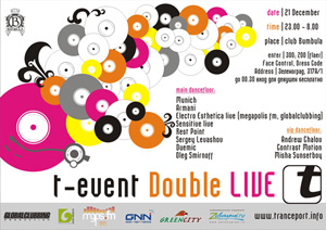 t-event double live - это коктейль из эйфорических мелодий и романтического (позитивного) настроения в сочетании со взрывными и энергичными ритмами, которые заставляет испытывать незабываемые эмоции и чувства на танцполе! Эта музыка поражает как разнообразием своего звучания, так и своей гармоничностью, и не оставляет равнодушными ценителей по-настоящему красивой и энергичной музыки.