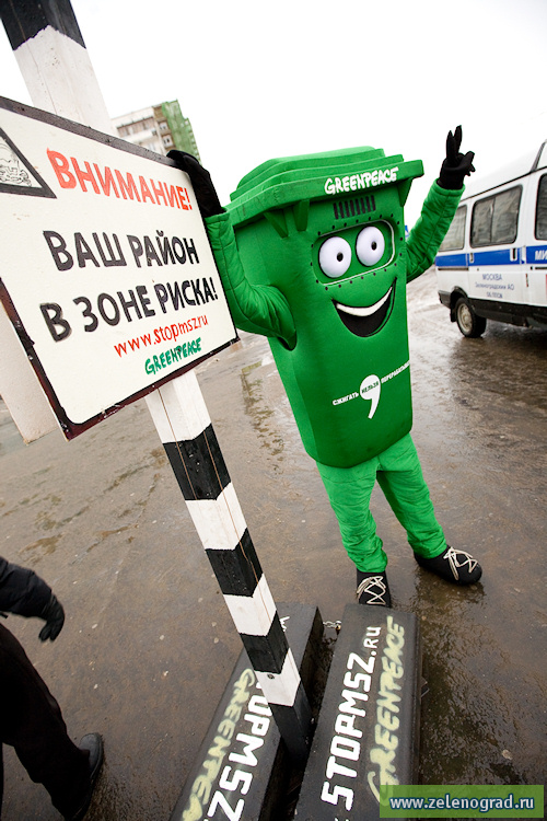 Руководил установкой столба необычный "активист" - мусорный бачок. Однако дежурившим на площади сотрудникам милиции симпатичный зелёный контейнер не понравился. Они задержали бачок и отвезли его в ОВД Панфиловского района, о чём задержанный рассказал в своём блоге. Зеленоградский столб - уже третий по счёту указатель МСЗ в столице. Первые два были ранее установлены в районе Речного Вокзала, а также возле метро "Битцевский парк".