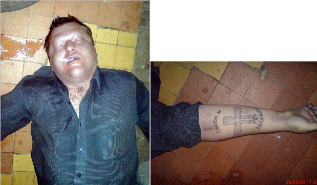 Приметы: на вид 30-35 лет, нормального телосложения, рост 180 см., лицо овальное, волосы тёмно-русые, нос прямой. Одежда: рубашка синяя в тонкую белую полоску, чёрные брюки, полуботинки чёрные. Особые приметы: на левой кисти у основания большого пальца татуировка в виде скорпиона, на тыльной стороне правого предплечья в виде креста и надписи "Спаси и сохрани".