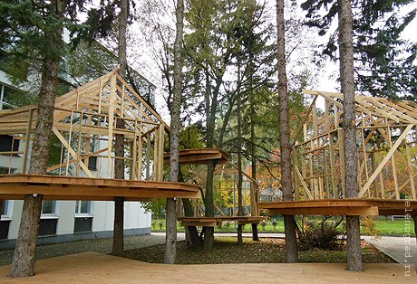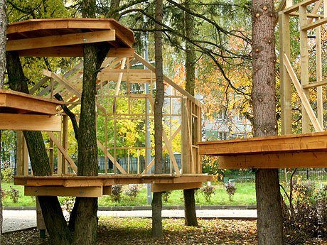 Мы набираемся таких идей и сами их придумываем, сейчас — для «Надземелья». До этого уже строили домики на деревьях в «Максатиха-кемп», детском кинолагере (280 км от Москвы на северо-запад) и на реке Нерская (70 км от Москвы на восток). В Максатихе домики на дереве созданы по «Чудесариуму», в том числе Радужный мост и крыша в виде головы фазана…
