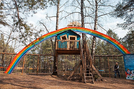 Как сказал один мой лучший друг — «Назови мне пятнадцать причин, почему это получится?», — когда мы ставили эту покрашенную детьми деревянную радугу на Нерской, а она была тяжеленной, 11 метров в диаметре! Её поднимали при помощи блоков на деревьях и верёвок 15 человек, и сейчас она третий год стоит над домиком. Мы впервые делаем такие вещи, я подобного нигде в России не видел.