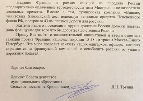 Обращение в Госдуму депутат направил в мае этого года. Концессионер строительства трассы — французская компания Vinci. Национализация трассы могла бы стать ответом на тогдашнюю ситуацию с вертолетоносцами «Мистраль», которые Франция отказывалась передать России. «Жители нашего поселения и другие граждане России должны платить дань французам, чтобы добраться до столицы Родины!», возмущается депутат.