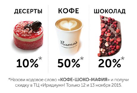 Магазин расположен на втором этаже «Иридиума», на фудкорте справа (раньше там был магазин мороженого). Торжественное открытие 12 ноября в 10 утра, а 12 и 13 ноября будут скидки на десерты, кофе и шоколад по кодовому слову «Кофе-шоко-мафия» и флаеру, которые будут раздавать в «Иридиуме» с утра. Для детей на открытии будет шоколадный фонтан с домашним зефиром.