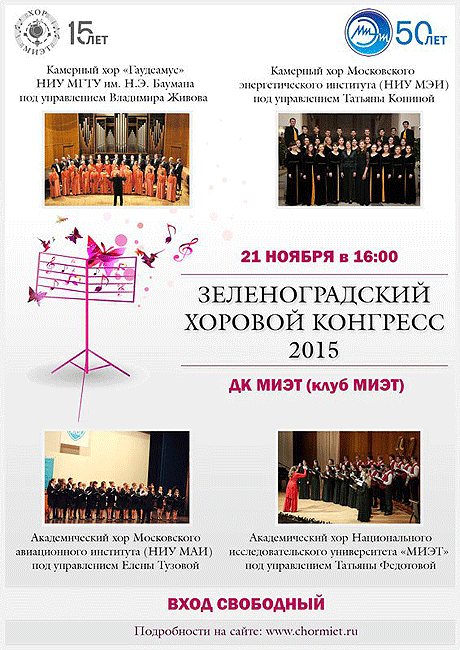 Это уже четвертый Зеленоградский хоровой конгресс, организатором выступает хор МИЭТ. В этом году концерт посвящен 50-летию МИЭТа и 15-летию хора вуза. Это встреча четырех поющих коллективов, каждый из которых представит интересную певческую программу.