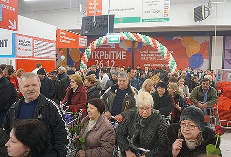 В 12:00 при открылся продуктовый гипермаркет «Ашан» — на входе даже образовалась небольшая толпа (фото: Zеленопарк)