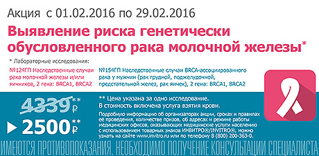 Независимая лаборатория «ИНВИТРО» проводит акцию «Выявление риска генетически обусловленного рака молочной железы».