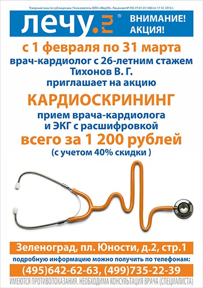 Врач-кардиолог с 26-летним стажем Тихонов В.Г. приглашает на акцию «Кардиоскрининг» до 31 марта в медицинский центр ЛЕЧУ.РУ (площадь Юности, дом 2, строение 1). Скидка 40%.