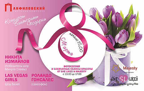 — Для милых дам с 13:00 до 17:00 будет работать бесплатная фотостудия с кардмейкингом — это изготовление открыток своими руками. Можно сделать фото на фоне красивого объемного сердца и создать прелестную открытку. Салон She likes и студия маникюра Majesty устроят сеансы красоты. Праздничные прически для наших посетительниц — абсолютно бесплатно. Плюс, для всех желающих пройдет мастер-класс по уходу за ногтями. Мастера салона She likes работают с 13:00 до 15:00, мастер студии маникюра — с 15:00 до 17:00.