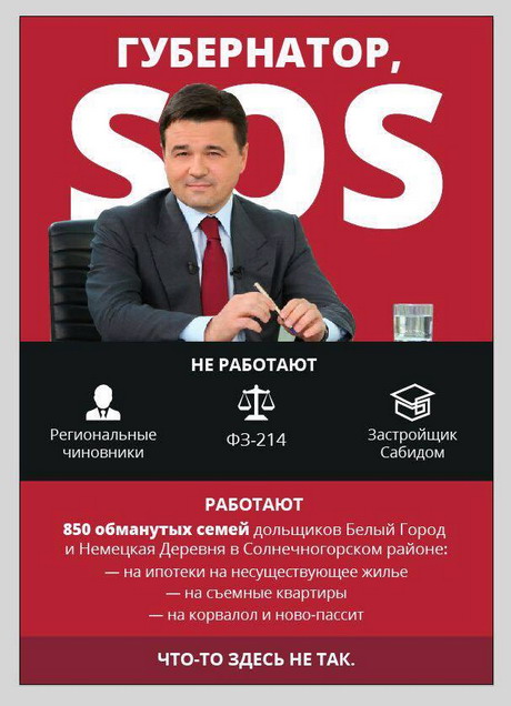 Взаимодействие с властями есть, проходят встречи на разных уровнях — и с главой Солнечногорского района, и в правительстве Московской области. Но пока это ни к чему не приводит. Уголовное дело не возбуждено, владельцы «Сабидом-Инвест» всё еще на свободе — продолжают тратить деньги и вполне доступны для следствия, как выяснили дольщики, установив за ними частную слежку. Их портреты — на плакатах каждого митинга.