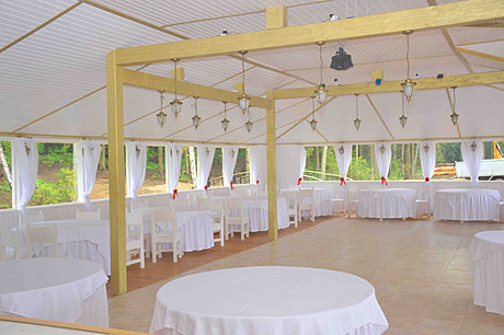 База отдыха идеально подходит как для классической европейской, так и для традиционно русской тематической свадьбы. Для гостей можно снять домики, в каждом из которых есть кухня, баня, душевые, туалеты, беседка, стоянка. Все коттеджи находятся на огражденной деревянным забором территории, поэтому постояльцам никто не будет мешать.