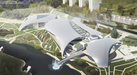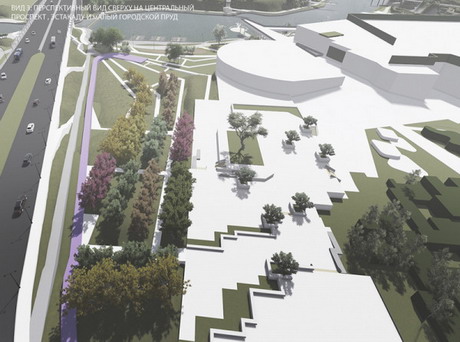 «Фишкой» экопарка должна стать пешеходная система, проложенная по плоским кровлям спортивно-развлекательного комплекса, состоящего из трех зданий — аквапарка, спортцентра и ТЦ. Прогулочный маршрут по плоской кровле можно оформить цветниками, газонами, скамейками, малыми архитектурными формами. Часть кровли, по мысли автора, следует занять под солнечные батареи — их энергия пойдет на освещение парка.