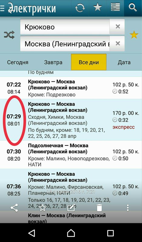 Например, в понедельник 18 апреля из Москвы идут два таких поезда (9:58 и 13:55), а из Зеленограда — один (в 20:58). Всего же на отрезке Москва — Крюково ходит в день около 230 поездов. То есть доля 25-минутных электричек, о которых мэр говорил президенту, примерно 1,3 процента.