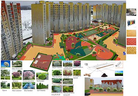 На территории проводится комплексное благоустройство. В проекте первой очереди — озеленение за счет МАФ конструкций, которые также выполняют функцию лавочек. Пешеходные дорожки и дорожное полотно укладываются современной брусчаткой. Контейнерные площадки закрыты на ключи доступа.