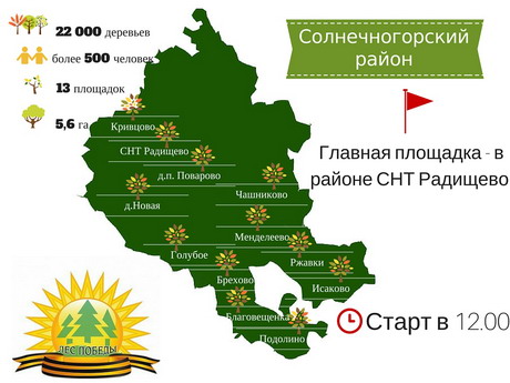 В Солнечногорском районе сажать «Лес Победы» вышло более полутысячи добровольцев, которые посадили 22 тысячи деревьев. Саженцы липы, березы, сирени появились на Аллее Ветеранов в посёлке Голубое, у памятника погибшим воинам в Кривцово, у церкви в деревне Новой, на территории детского садика в Ржавках. На лесную площадку в районе СНТ «Радищево» приехал глава района Александр Якунин. Во время акции здесь высадили 21200 молодых сосенок.