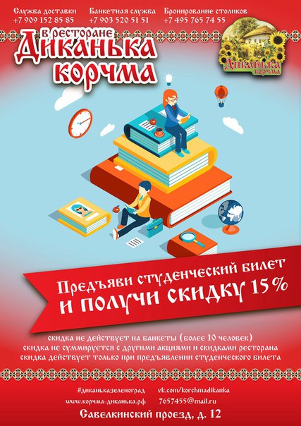 Корчма «Диканька» предлагает прекрасные скидки студентам. 15% на меню при предъявлении студенческого билета. На сытый желудок — и учиться веселее, и к сессии готовиться — гораздо результативнее.