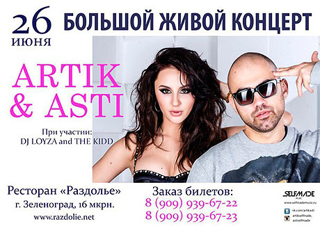 26 июня в ресторанном комплексе «Раздолье» состоится большой живой 1,5 часовой концерт группы «Artik & Asti» при участии DJ LOYZA and THE KIDD!