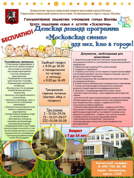 В реабилитационном центре „Ремёсла“ (корпус 1124) программу летнего лагеря обещают насыщенную: „Вслед за утренней зарядкой и завтраком детей ждут конкурсы, викторины и выездные экскурсии, в том числе в пожарную часть, кинологическую службу, театры, музеи. После обеда в расписании спортивные мероприятия, подготовка праздников, игротека, видеосалон и другие развлечения“, — рассказали Zelenograd.ru в центре.