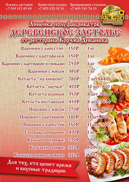 Так же, кто не успевает готовить, или не хочет тратить свое время на готовку, корчма «Диканька» предлагает прекрасные варианты: готовые полуфабрикаты, довести которые до вашей тарелки — дело буквально пяти минут.