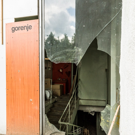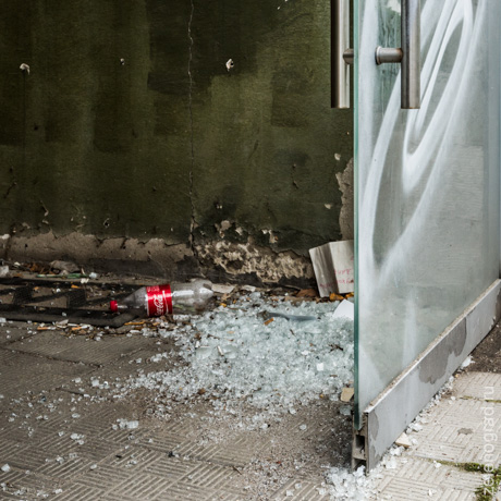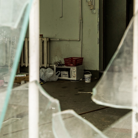 Департамент то ли считает, что бывшие арендаторы сами должны следить за пустыми помещениями, то ли не считает нужным хоть как-то скрыть разруху — стеклянные витрины разбиты и изрисованы, внутри кучи хлама. Впрочем, не только хлама — здесь брошено и целое торговое оборудование, и остатки офисной мебели. В заброшенные помещения и подвал с коммуникациями жилого года может залезть что угодно — это на заметку полиции, МЧС и районной антитеррористической комиссии.