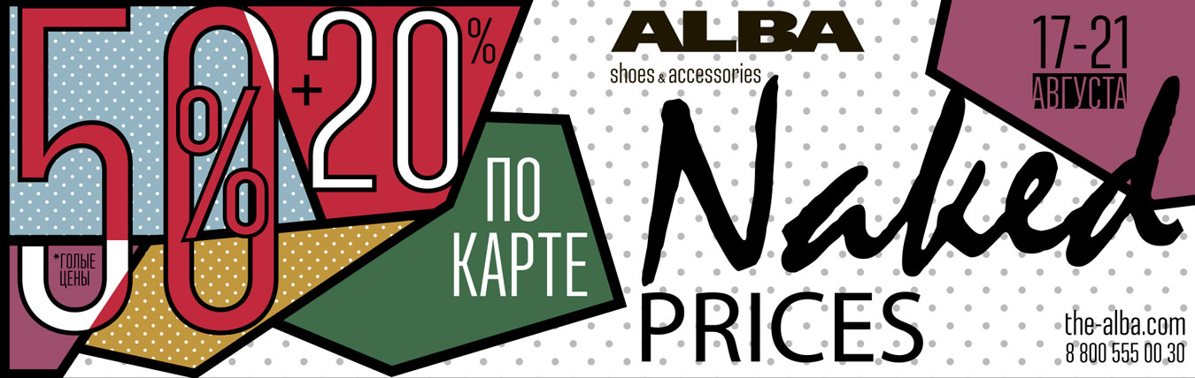 17-21 августа вся коллекция весна-лето 50% OFF +уникальная скидка 20% дополнительно по карте Клиента в сети итальянской обуви и аксессуаров ALBA!