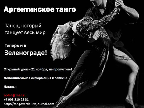 В субботу 21 ноября танцевальная школа начинает занятия и проводит первый открытый урок. Танго по определению «Википедии» — парный бальный танец свободной композиции, отличающийся энергичным и четким ритмом. Организатор зеленоградской школы Наталья рассказывает более экспрессивно: «Аргентинское танго — это один из самых красивых танцев в копилке мировой культуры. Танго — это импровизация, история, которую вы рассказываете сами, разговор двух людей и музыки. Танго обладает богатой историей и традицией, а научиться танцевать его по силам каждому. Для этого не нужно специальной подготовки, особой физической формы, необходимо только ваше желание, любовь к музыке и немного усердия».