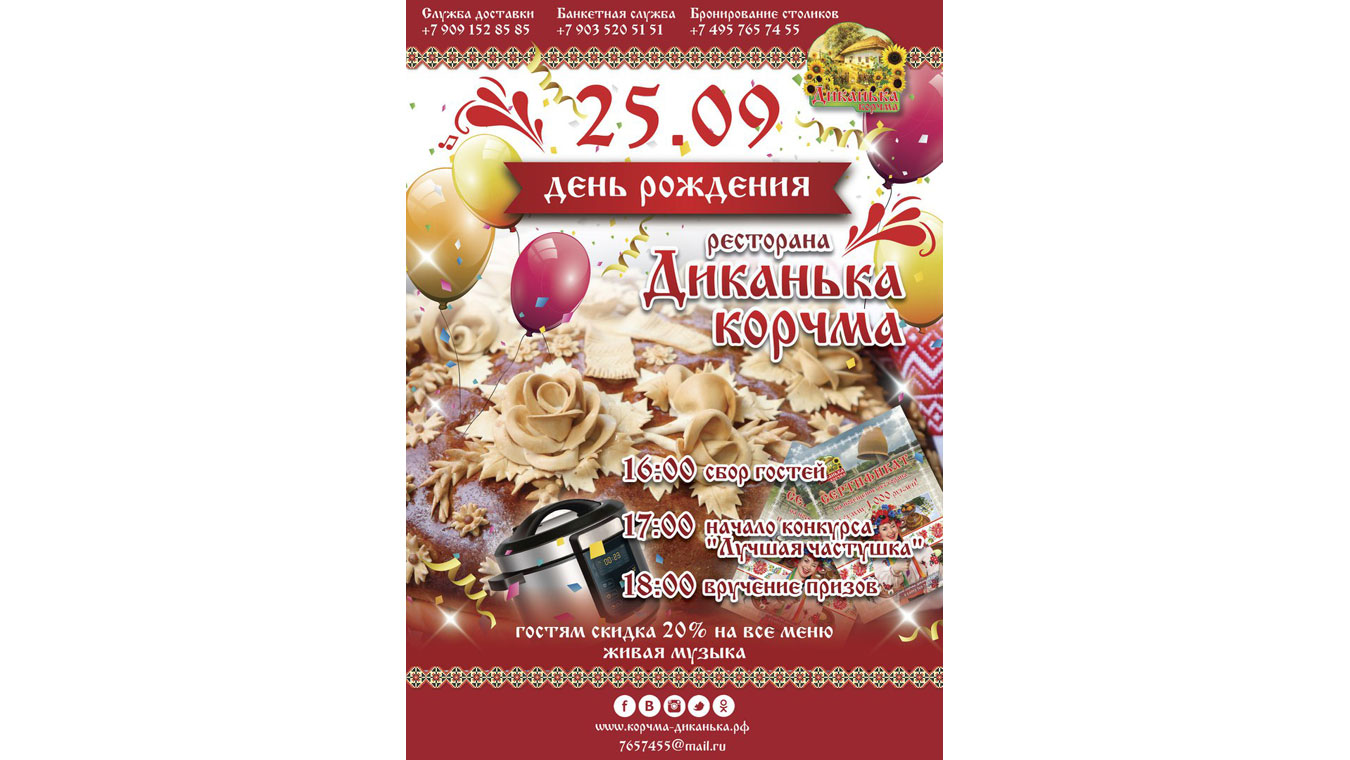 25 сентября ресторан Корчма «Диканька» празднует день рождения! На протяжении многих лет мы делали все возможное, чтобы радовать вас вкусными блюдами и домашней атмосферой тепла и уюта. И нам бы очень хотелось, чтоб в День Рождения ресторана Вы бы были с нами.