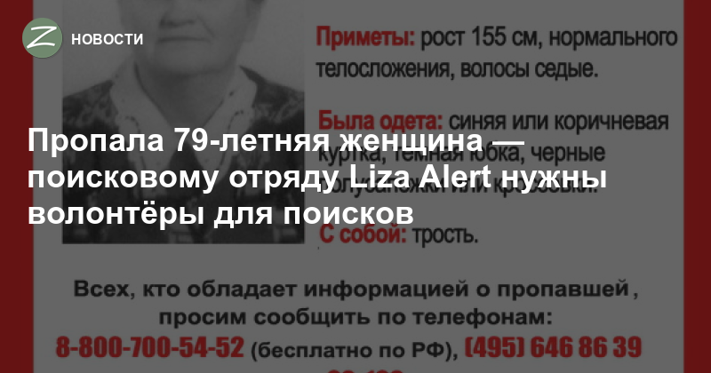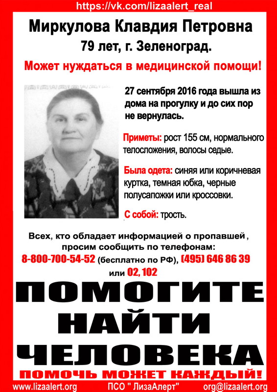 Пропала зеленоградка Миркулова Клавдия Петровна, 79 лет — во вторник 27 сентября она ушла из дома в 1 микрорайоне и не вернулась. Позже от неё поступил телефонный звонок — «Бабушка позвонила и сказала, что лежит и не может встать», сообщили в Liza Alert. Полиция, МЧС, родственники и добровольцы вели поиски всю ночь и продолжают их 28 сентября. Нужна помощь волонтёров в Зеленограде, на автомобилях и пеших.