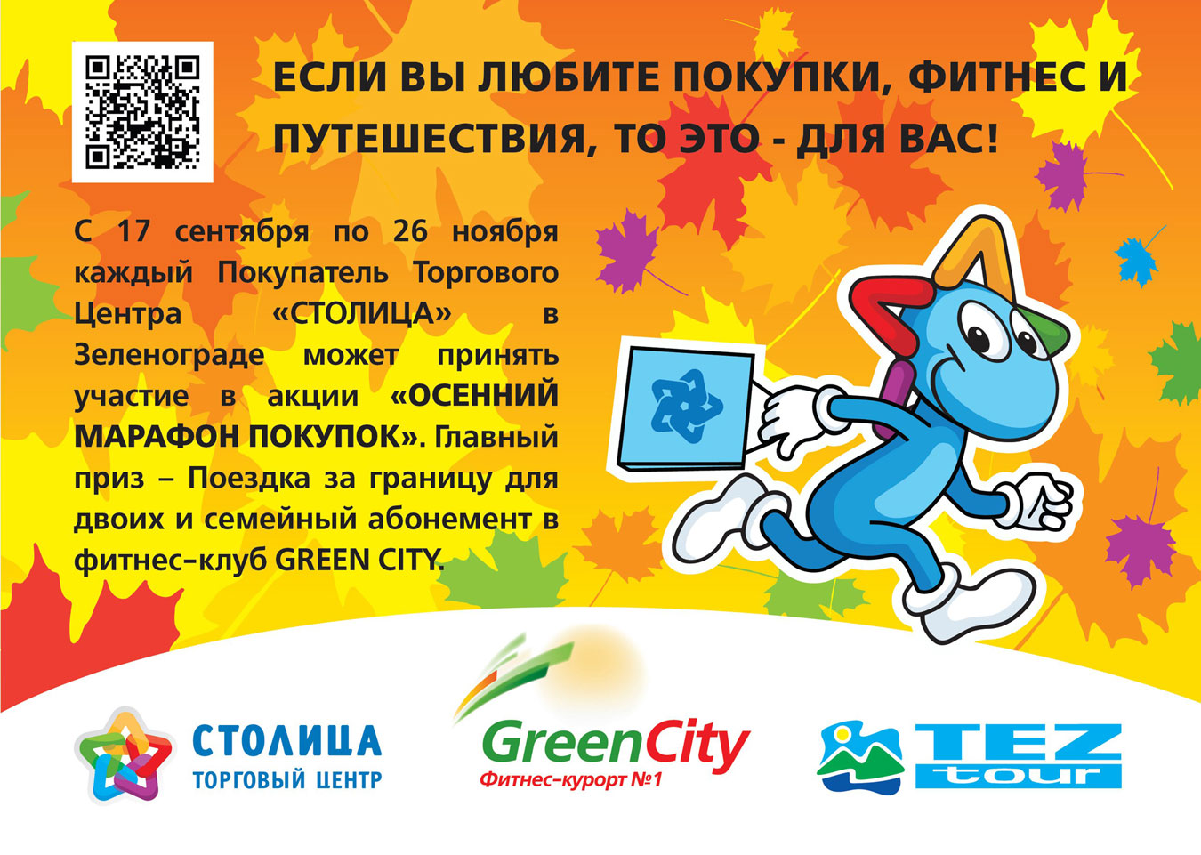 С 17 сентября по 26 ноября каждый покупатель ТЦ «Столица» в корпусах 2309 и 1446 может принять участие в акции «Осенний марафон покупок» и выиграть поездку за границу или абонемент в фитнес-клуб Green City.