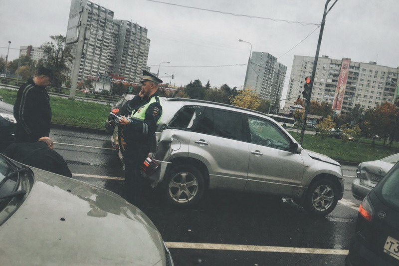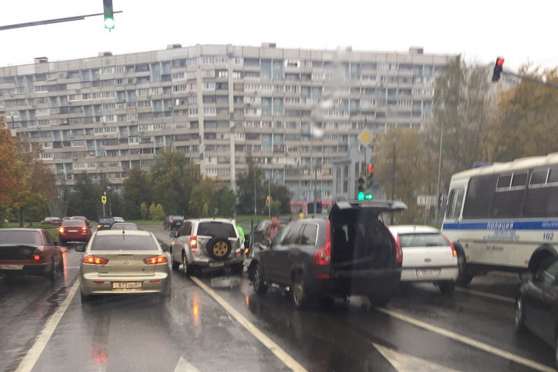 «Водитель на „Вольво“ мощно влетел в три машины. Длинная пробка», «Две полосы заняты, — сообщили около 12 часов очевидцы Вконтакте.