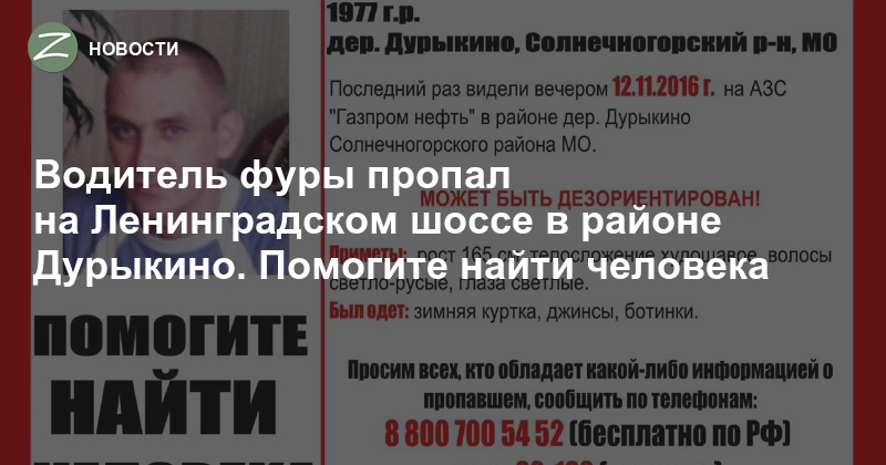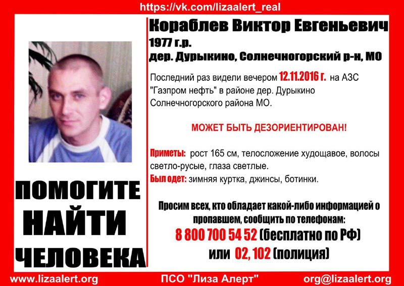 39-летний водитель-дальнобойщик Виктор Кораблёв пропал по пути в Москву — в последний раз его видели в районе деревни Дурыкино на заправке «Газпром нефть» около восьми вечера в субботу, 12 ноября.