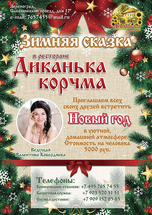 Мы пригласили блестящую ведущую Валентину Ковердяеву, которая будет развлекать Вас в новогоднюю ночь. Те, кто был с нами в предыдущие годы, знают, что скучать не придется, наоборот, наша ведущая — настоящая волшебница! Вся программа подготовлена и рассчитана на то, что оригинальные номера, выступления великолепного диджея с музыкальными хитами, будут чередоваться с веселыми конкурсами и викторинами с гарантированными призами! Все пройдет на одном дыхании: свежо, оригинально, празднично!