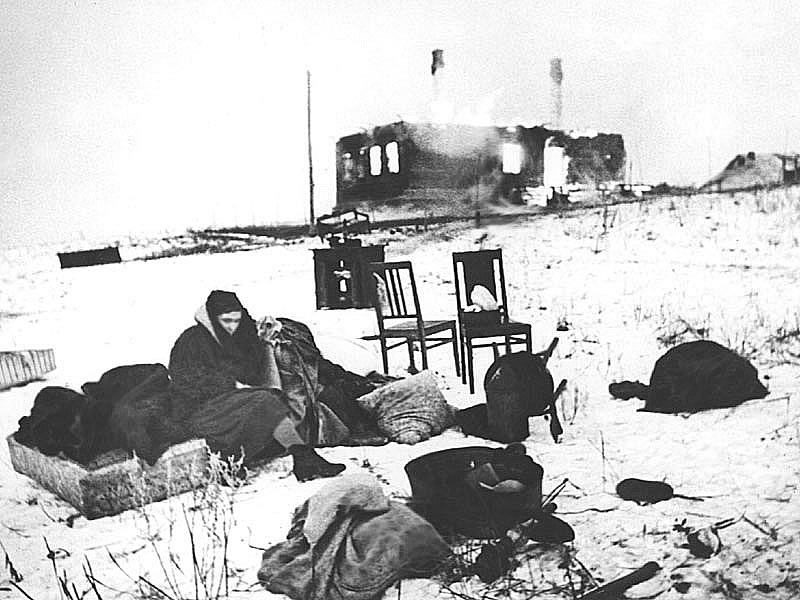 Отступая, немцы сожгли и порушили всё, что удалось. В уцелевших домах они оставили бутылки с горючей смесью (одну такую мы нашли у бабушки в доме и чуть было не сгорели). К счастью наши сапёры обнаружили это, и никто из жителей не пострадал.