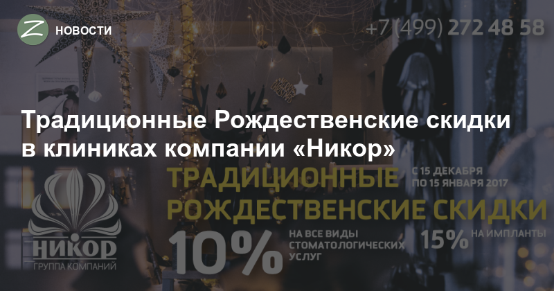 До 15 января во всех клиниках «Никор» действуют «Традиционные Рождественские скидки» — 10% на все виды стоматологических услуг и 15% на импланты.