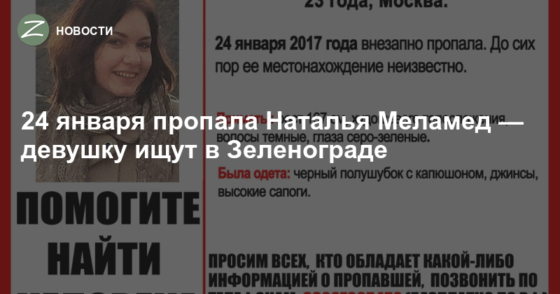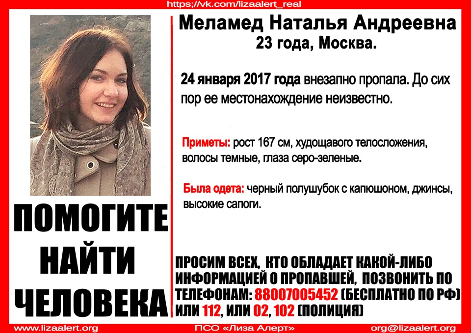 24 января в Митино ушла из дома и пропала 23-летняя Наталья Меламед. Поиски ведут полиция и волонтёры поисково-спасательного отряда «Лиза Алерт». По последней информации девушка могла побывать в Зеленограде на территории «нового города» — сейчас волонтёры распространяют ориентировки о ней на улицах и в различных учреждениях города.