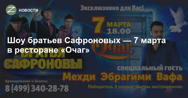 Ресторан Очаг приглашает посетить уникальное шоу великих иллюзионистов — братьев Сафроновых! Также, впервые в Зеленограде, специальный гость, сильнейший экстрасенс современности, победитель 3 сезона «Битвы экстрасенсов» Мехди Эбрагими Вафа!