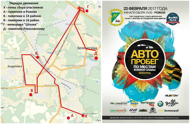 Автопробег «По местам боевой славы» организовали в честь Дня защитника Отечества сообщество зеленоградских автомобилистов ЗелАО AUTO, Молодежная палата района Крюково и зеленоградский Совет ветеранов. Акция стала массовой — в автопробеге приняли участие более 60 автомобилей и около 200 человек, от ветеранов до дошколят. Участников не испугала ненастная погода, ветер и мокрый снег утром 23 февраля.