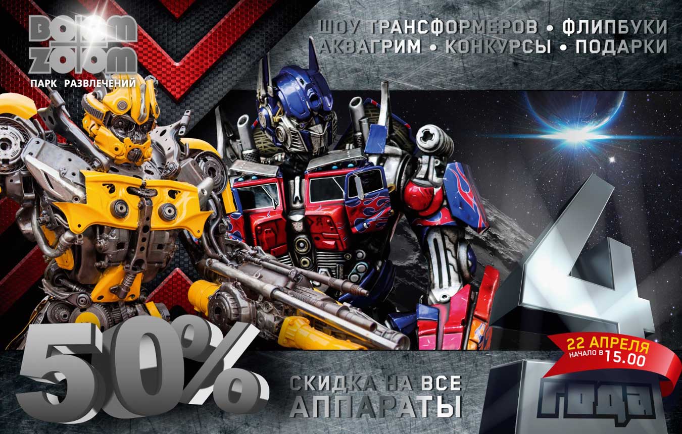 Парку развлечений BoomZoom исполняется 4 года! Только 22 апреля весь день скидка на ВСЕ аппараты 50% и праздничная программа!