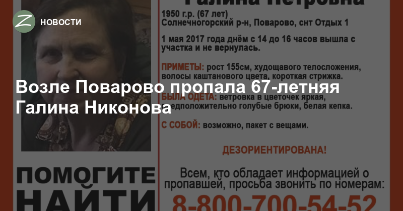 Днем 1 мая 67-летняя Галина Никонова вышла со своего участка в СНТ «Отдых-1» возле Поварово и не вернулась. Приметы: рост 155 см худощавого телосложения, каштановые волосы, короткая стрижка. Была одета в яркую ветровку в цветочек, предположительно голубые брюки и белую кепку. Возможно, с собой пакет с вещами. Звоните 8(800)700-54-52 или 112.