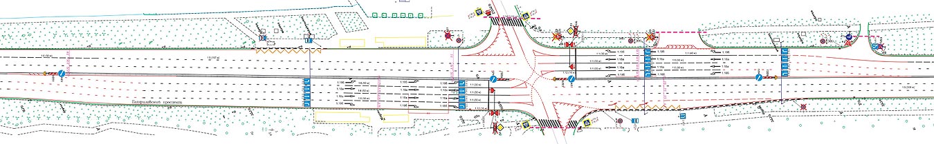 На пересечении Панфиловского проспекта, улиц Летчика Полагушина и Болдов Ручей сделают дополнительный ряд для поворота. Большинство водителей в левом ряду Панфиловского едут в сторону Ленинградского шоссе (или обратно), им приходится перестраиваться в соседний ряд. Предлагается разметка, которая будет уводить двигающихся прямо немного правее, а те, кому нужно налево или в обратную сторону, перестроятся в новый дополнительный ряд.