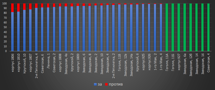 Голосуют в основном «за». Сейчас доля собственников, поддерживающих снос своих домов, в среднем 97 процентов. Но это в среднем. Единогласно за снос проголосовали только в восьми из 34 зеленоградских «пятиэтажек». При этом ещё в восьми домах доля «против» в среднем превышает 10 процентов. Выделяются два корпуса 18 микрорайона, где против 17-18 процентов голосов.