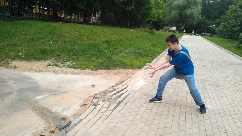 Брусчатка разъехалась веером на стыке пешеходной тропинки с примыкающим перпендикулярно заасфальтированным проездом от корпуса 1209. Вдоль газонов плитку держит бордюр, а на месте разрывов, где дорожки пересекаются, — никаких ограничителей. Видно, что песок по границе тротуара пытались превратить в скрепляющую смесь. Только вот смесь, как определили подростки опытным путём, рассыпается в ладони от лёгкого нажатия пальцем. Субстанция всё ещё была влажной, хотя, вероятно, подразумевалось, что за несколько дней уже должна была превратиться в камень.