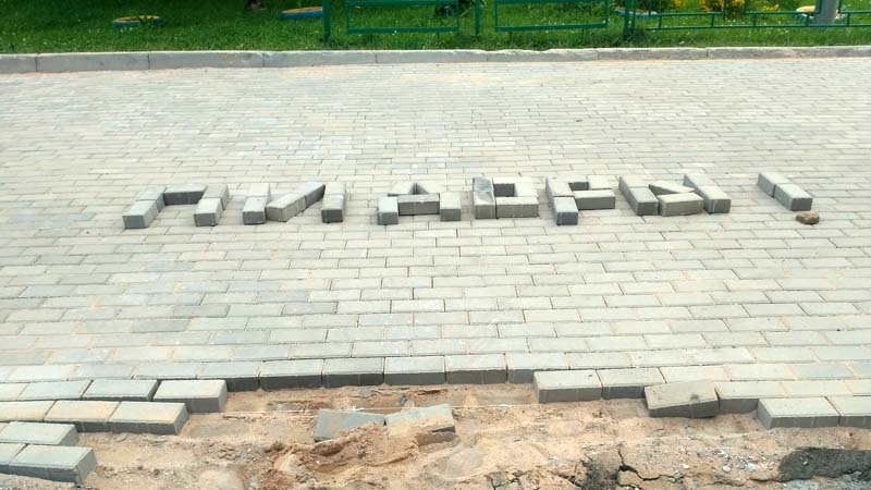 Столкнувшись с таким безобразием, ребята возмутились, оценили-проанализировали, как могли, и выложили отвалившимися брусками слово «пидоры», которым характеризуют своё отношение ко всем причастным к подобной халтуре.