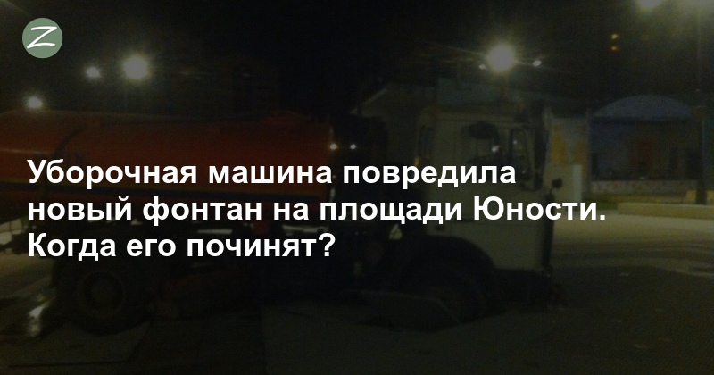 Машина въехала новый плоский фонтан на площади Юности прогнула его покрытие и провалилась в образовавшуюся дыру колесами. Ремонтники говорят, что быстро восстановить не получится.