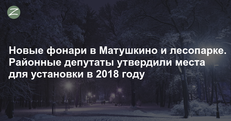 Адреса установки фонарей одобрили депутаты района Матушкино. «Мы собрали все заявки и просьбы за 2017 год — от жителей, депутатов, управа проанализировала, где нужно сделать освещение», пояснил на заседании глава муниципального округа Матушкино Владимир Анисимов. Он отметил, что заявки, поступившие в конце прошлого года, также будут обсуждены и отправлены в департамент ЖКХ.