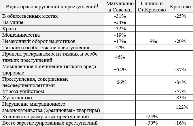 Подавляющее большинство раскрытых показателей говорят о снижении числа определенных видов правонарушений и преступлений. Там, где число преступлений выросло отмечается и рост раскрываемости. Например, в Силино по наркотикам или в Крюково по «резиновым квартирам». Только в Матушкино-Савёлках показанный в отчете рост преступлений, совершенных несовершеннолетними, и умышленного причинения тяжкого вреда здоровью отмечают как «негативный фактор». Значит ли это, что за всеми пропусками стоит рост показателей, непонятно.